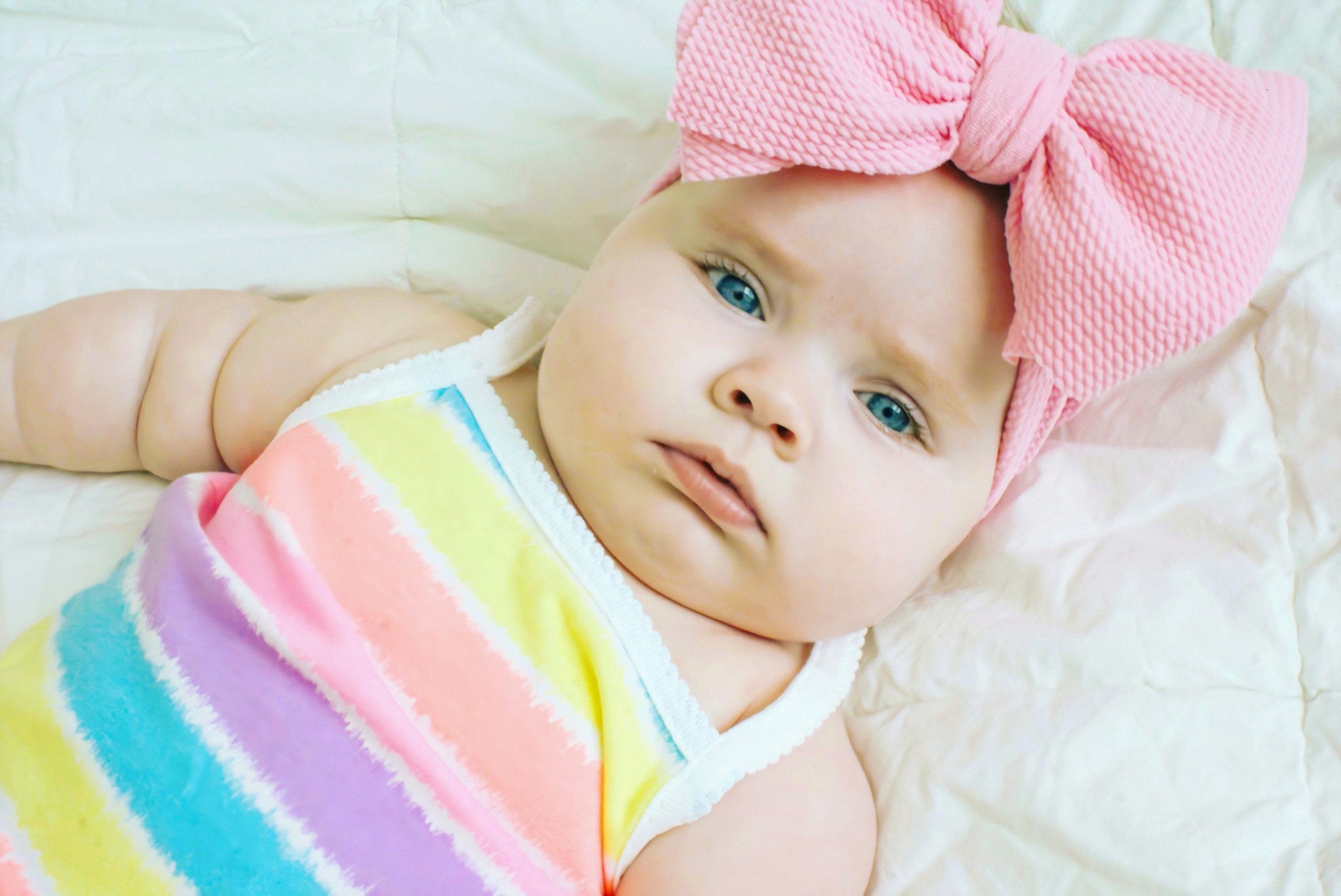 These soft stretchy headwraps are a no sew, single layer, raw edge bow. These bows are perfect for those mommas who don't want to tie and untie a bow every time they are getting their little ready.